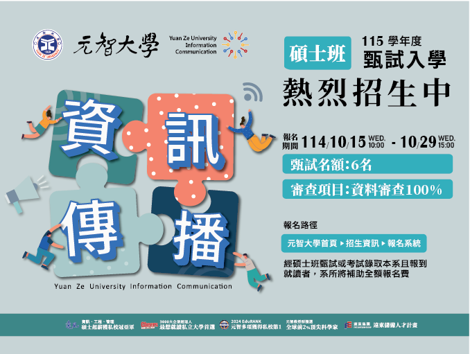 32003桃園市中壢區遠東路135號 元智大學資訊傳播學系 (系辦5413R)